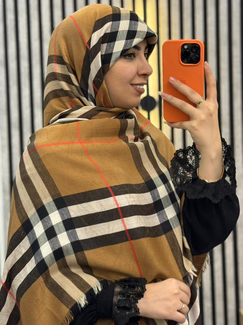 روسری کشمیر پاییزه وارداتی طرح باربری دور ریش رنگ قهوه ای جنس اورجینال