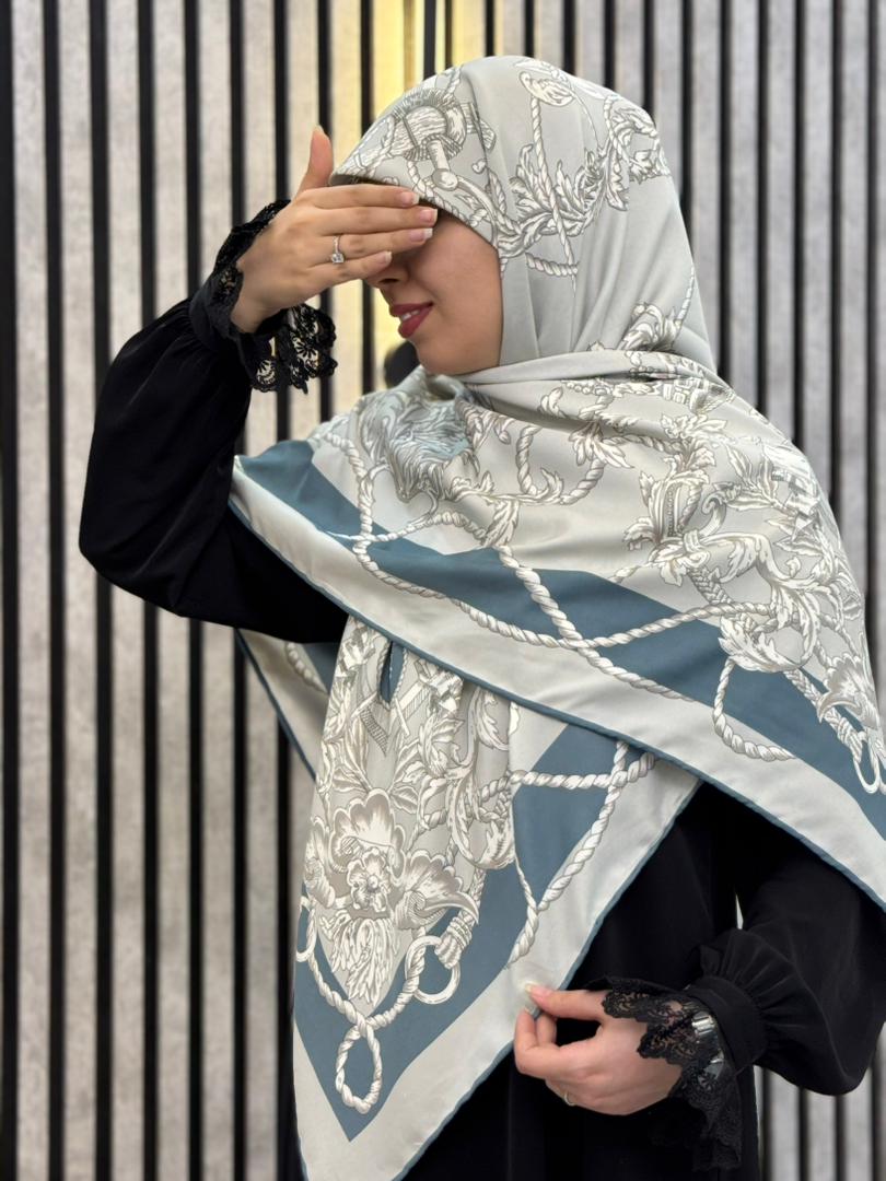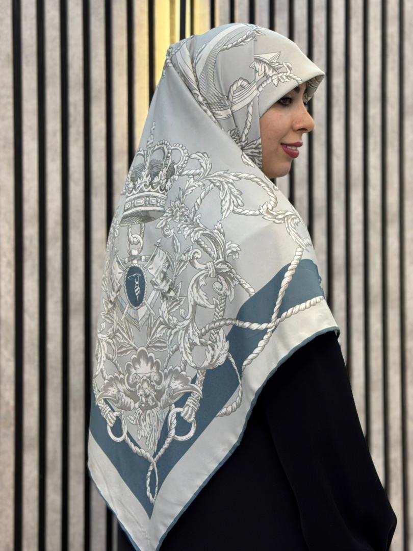 روسری ابریشم توییل وارداتی طرح تاج و زنجیر رنگ طوسی آبی