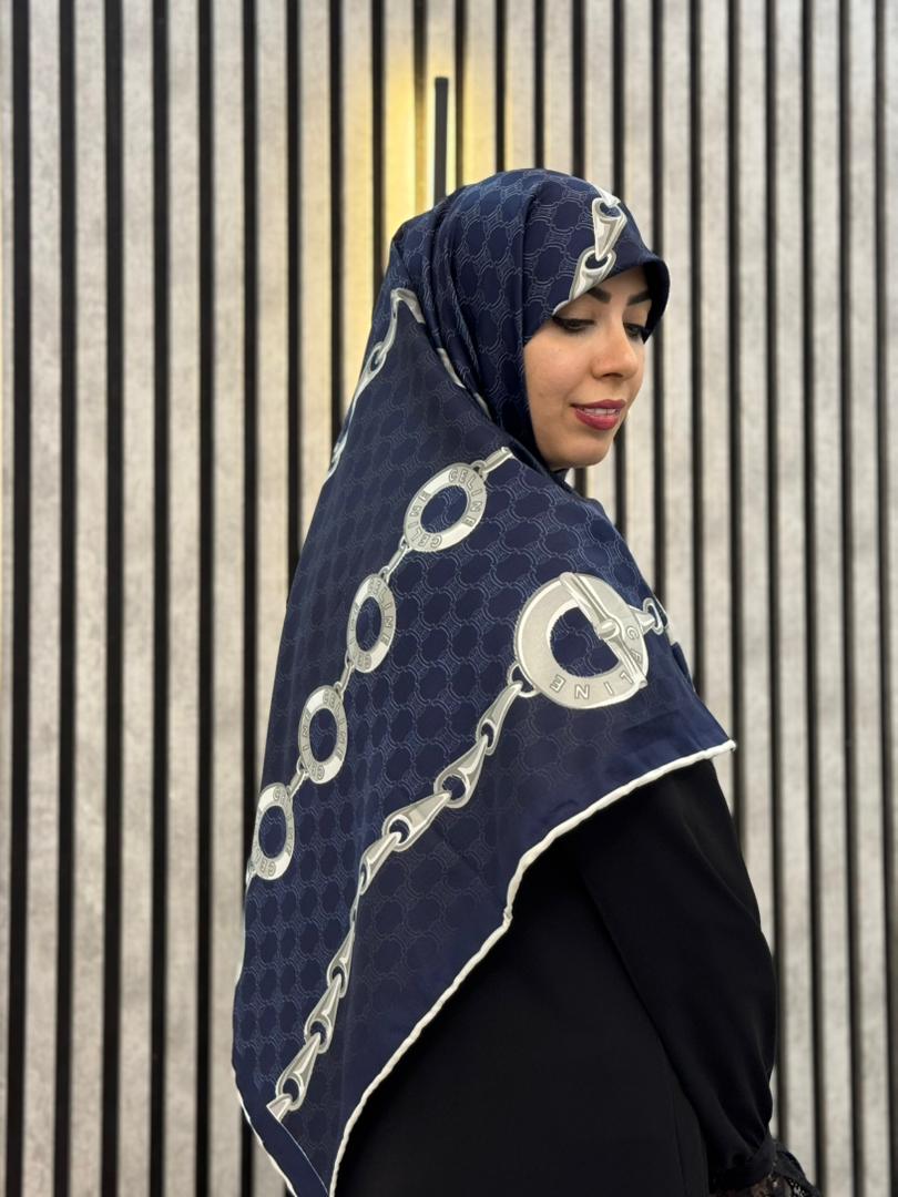 روسری ابریشم توییل وارداتی طرح زنجیر رنگ سورمه ای کد 001