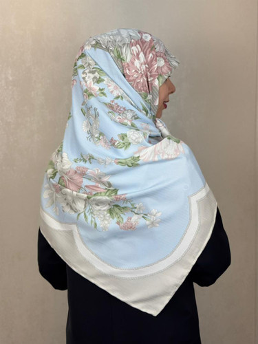 روسری ابریشم ژاکارددور دست دوز وارداتی طرح گل رنگ آبی پاستیلی با گل های صورتی
